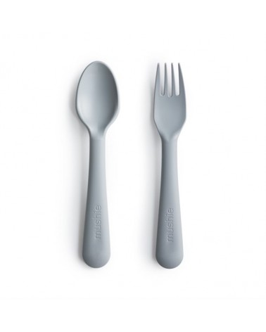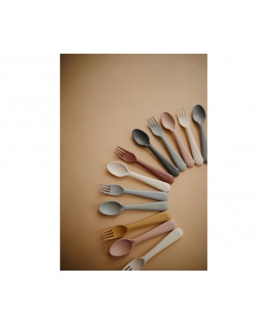 Com cores suaves e um design clean, este conjunto de talheres, com garfo e colher, é simples e elegante - e fácil para seu bebê e criança segurar.
