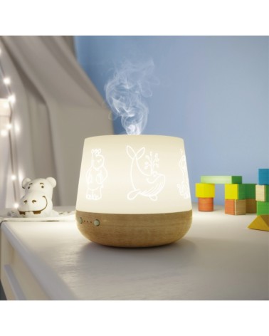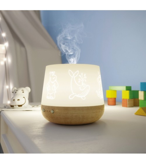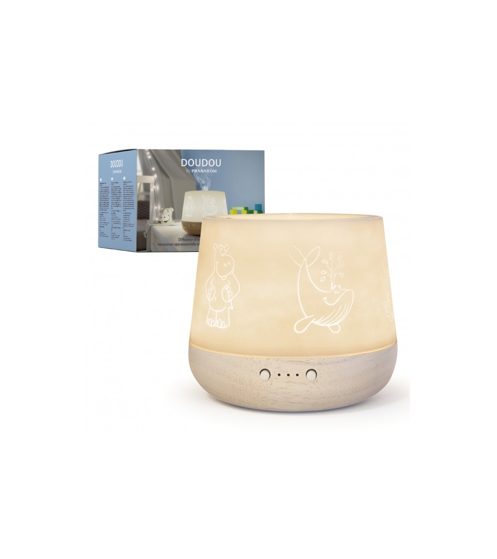 « Olá, o meu nome é Doudou. Eu difundo óleos essenciais de cheiro suave e emito uma luz discreta de acordo com os seus gostos. Sou um pequeno difusor e adoraria ter um cantinho nos espaços onde vivem os seus filhos. Se você me adotar, serei sua companheira noturna e, junto com todos os meus amigos animais, zelarei por seu sono. Você pode receber os sonhos mais doces e noites tranquilas para toda a família. Não sou muito exigente: bastam algumas gotas de óleos essenciais selecionados para difusão de bebês na minha caixa d'água e um pouco de energia, e estarei pronto para cumprir minha missão.